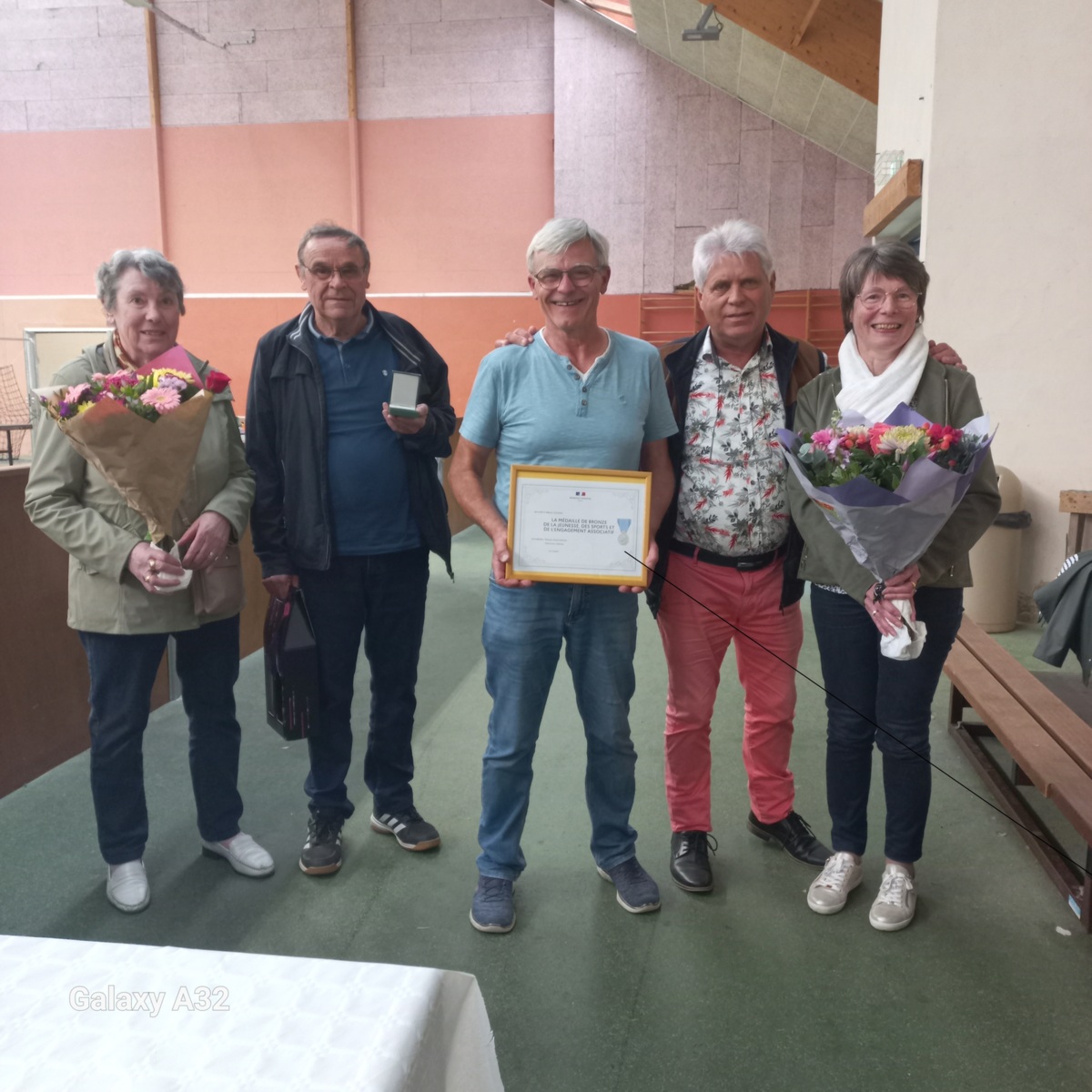 La 2ème distinction à Mr Michel Dartois Vice-Président qui s'est vu attribuer la médaille de bronze de la jeunesse, des sports et de l'engagement associatif pour plus de 40 années de bénévolats. Michel a en effet commencé son action de bénévolat et d'encadrement dès l'âge de 18 ans auprès de la section football, il a ensuite rejoint le club de tennis de table dans les années 1980 et depuis il a toujours œuvré au sein du club en particulier sur la formation des jeunes pongistes.